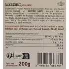 Ingrédients : Viande fraîche de porc (origine France) – gras de porc (origine France) – sel – LACTOSE (LAIT) – dextrose – épices et plantes aromatiques – conservateur : nitrate de potassium – ferments – poudres de fleurage : carbonate de calcium, farine de riz. Boyau naturel de porc. 152 g de viande de porc mise en œuvre pour 100 g de produit fini.