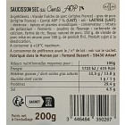 Ingrédients : Viande fraîche de porc (origine France) – gras de porc (origine France) – Comté AOP 7 % (LAIT) -sel – LACTOSE (LAIT) – dextrose – épices et plantes aromatiques – conservateur : nitrate de potassium – ferments – poudres de fleurage : carbonate de calcium, farine de riz. Boyau naturel de porc. 132 g de viande de porc mise en œuvre pour 100 g de produit fini.