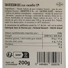 Ingrédients : Viande fraîche de porc (origine France) – gras de porc (origine France) – NOISETTES 5 % - sel – LACTOSE (LAIT) – dextrose – épices et plantes aromatiques – conservateur : nitrate de potassium – ferments – poudres de fleurage : carbonate de calcium, farine de riz. Traces éventuelles de moutarde. Boyau naturel de porc. 137 g de viande de porc mise en œuvre pour 100 g de produit fini.